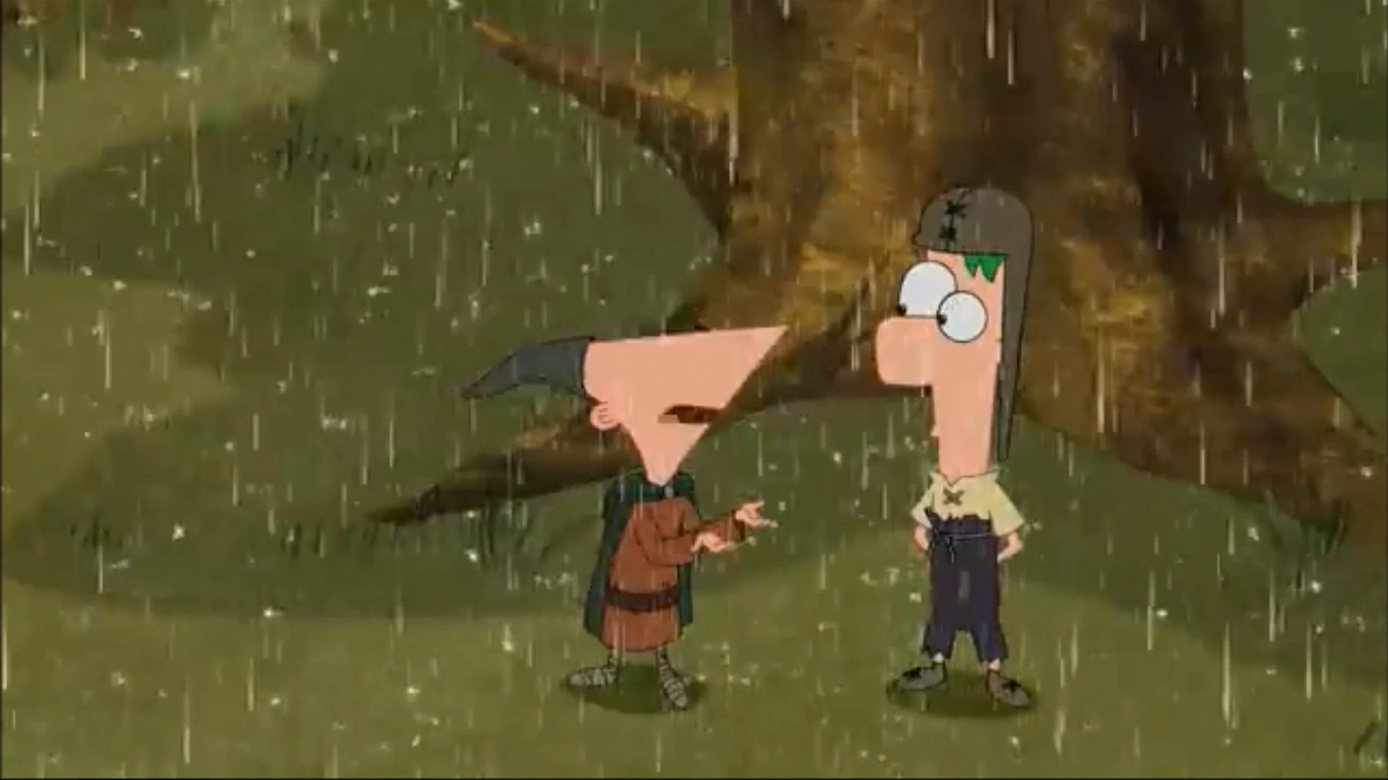Isabelle: Sim, primeiro devem atravessar o Rio Roncador da Incerteza pela Ponte da Compreensão. Depois, devem desbravar o Pântano das Atitudes Levianas. Daí tá na hora do lanche, eu trouxe maçãs. Depois disso, entrarão na Caverna dos Dez Mil Monstros, onde a espada de Excaliferb se encontra. Ferb, só um guerreiro de coração puro pode tirá-la da pedra, e empunhá-la na batalha contra o feiticeiro do mal, Malifashmirtz. Ferbalot: Tá. Ok, já fui informado.